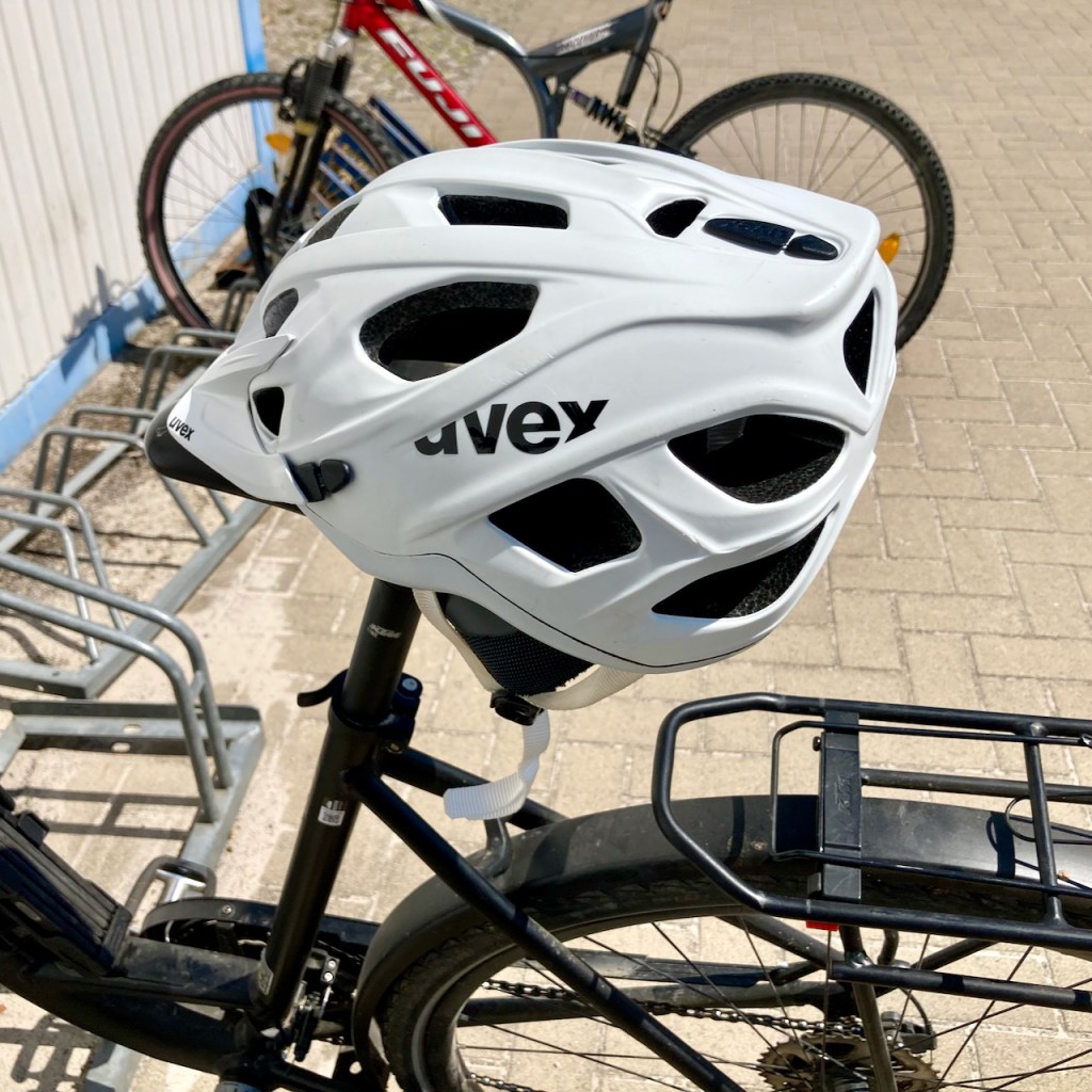 In der Sonne wird der Sattel heiß – sehr heiß! Ich habe aber keine Lust, mir den Hintern zu verbrennen, nur weil ich das Rad mal kurz abstelle. Aber, denkt sich die Meisterin der Zweckentfremdung: Ich habe ja einen weißen Helm. Weiß reflektiert. Zur Nachahmung unbedingt empfohlen!