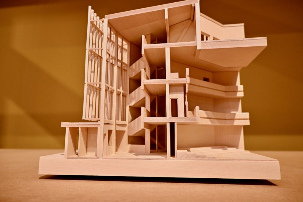 Die ersten Teile der Ausstellung wirkten sehr kleinteilig: viele kleine Fotos, viele kleine Modelle. Dazu kam eine grellbunte Beleuchtung und unterschiedliche Bodenbeläge, die es mir nicht leicht machten – mal stolperte ich, mal erwartete ich eine Kante, wo keine war.