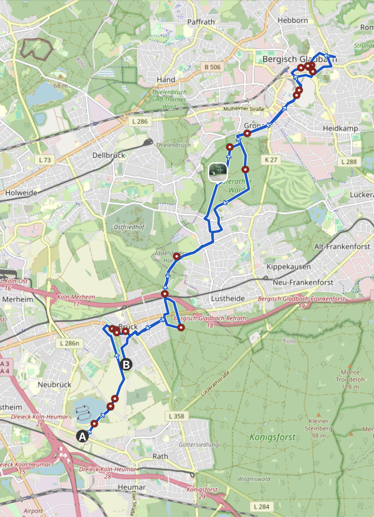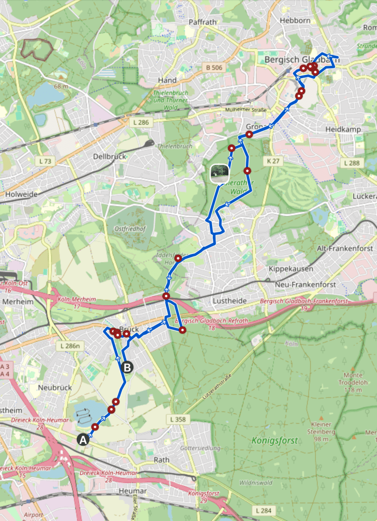 Eigentlich wollte ich noch bis zu einem Bücherschrank in Rommerscheid, aber in Bergisch Gladbach kam zuerst eine verkehrsreiche Straße und dann eine fiese Steigung. Außerdem hatte ich kein Buch dabei, das ich hätte freilassen können. Also bin ich unverrichteter Dinge wieder zurückgefahren. Auf dem Rückweg durch den Wald war es dann schon ziemlich düster – kein Fotolicht mehr.