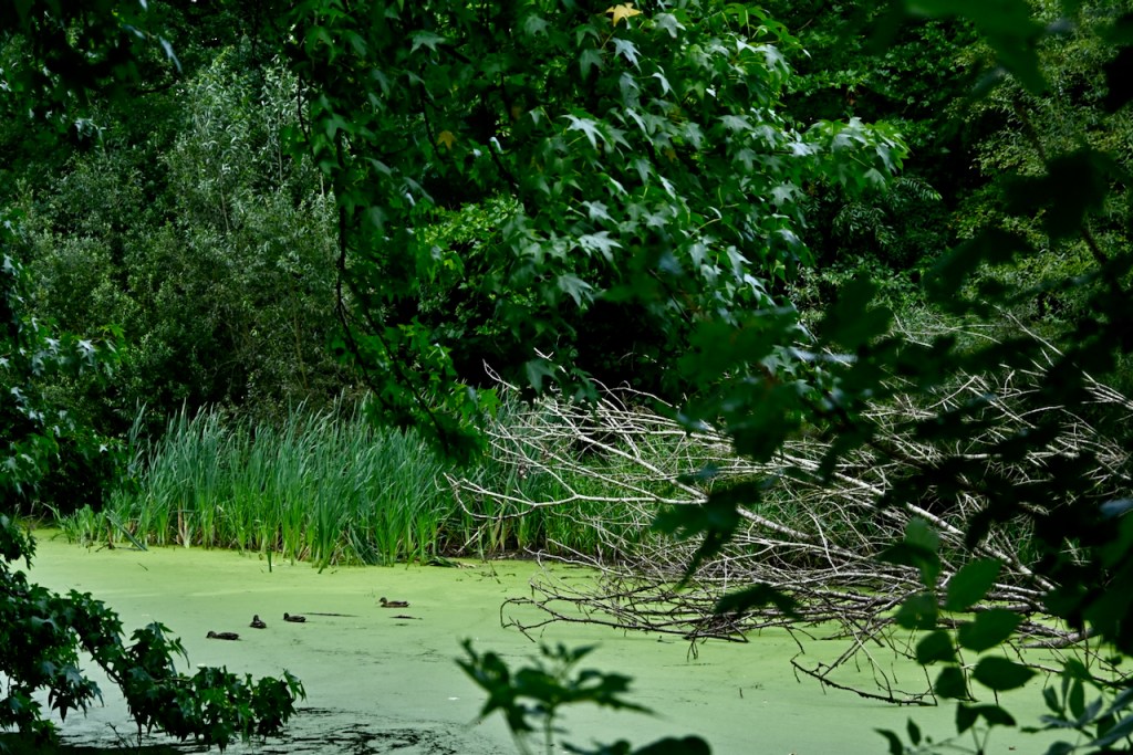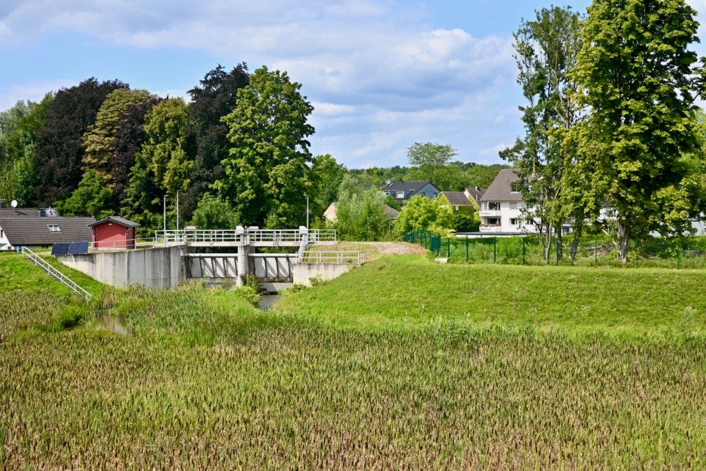 In Gronau fließt die Strunde durch ein Rückhaltebecken, das von einem hohen Zaun umgeben ist. Momentan ist das Becken fast vollständig mit Schilf bewachsen. Wie schon bei der Lumix lässt sich auch bei der Nikon der Monitor in alle Richtungen klappen – hier war das mal richtig praktisch.