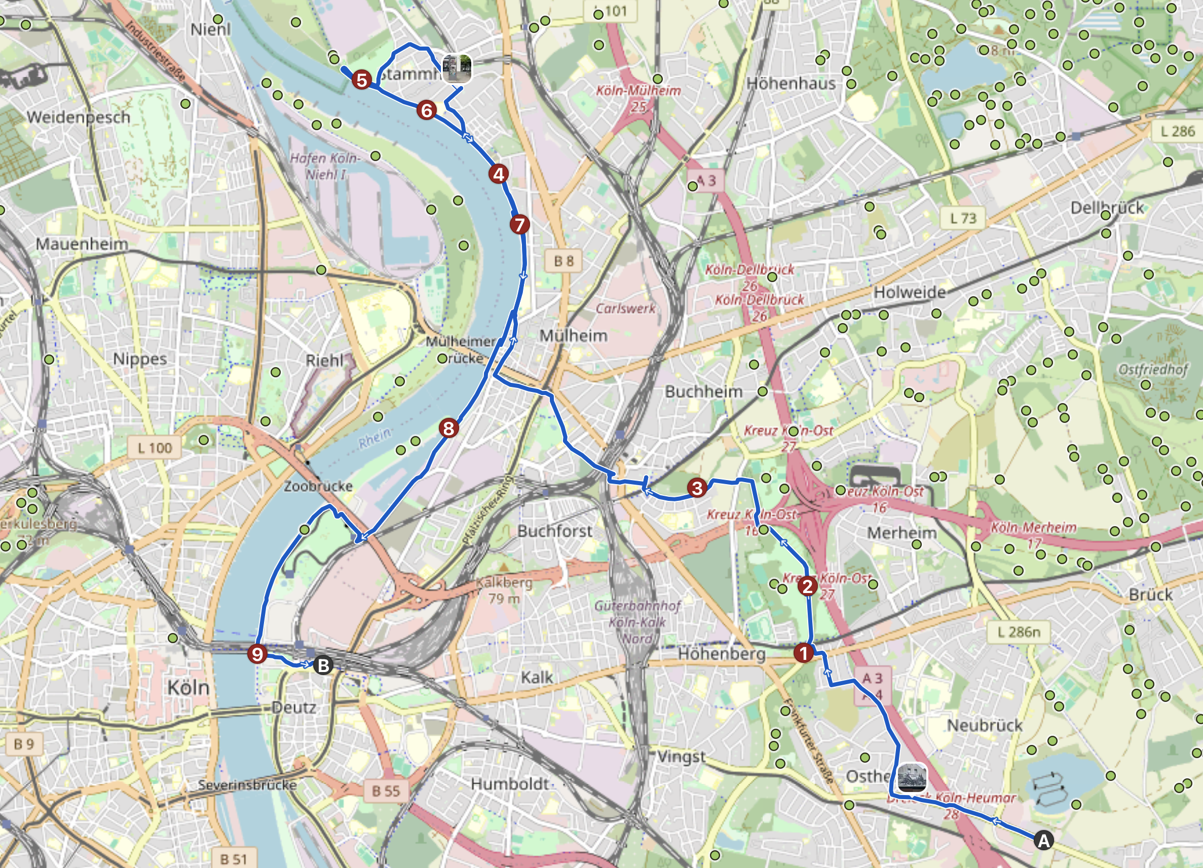 Ich kenne die Strecke bis zur Mülheimer Brücke inzwischen gut, wundere mich aber trotzdem immer noch, wie grün und ruhig sie auf weiten Abschnitten ist. Dabei habe ich sie irgendwann selbst geplant. Die offizielle Route würde über die Rösrather Straße und dann über die Frankfurter Straße führen.