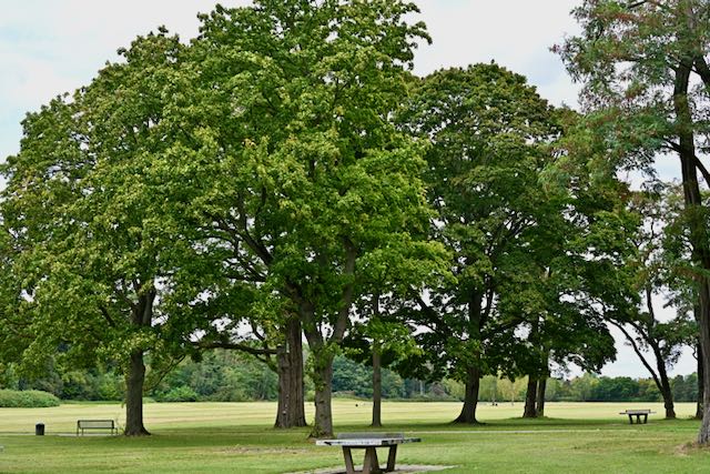 Die Merheimer Heide liegt ziemlich verwaist da. Die Rasenflächen sind kurz geschoren, nur an den Rändern ist etwas Wildwuchs erlaubt.