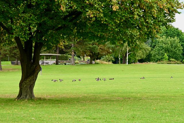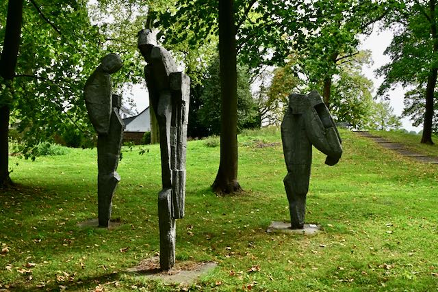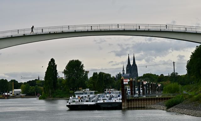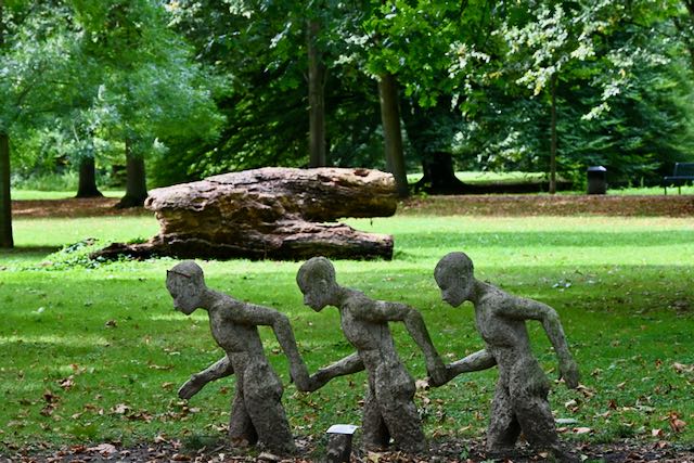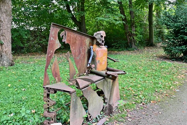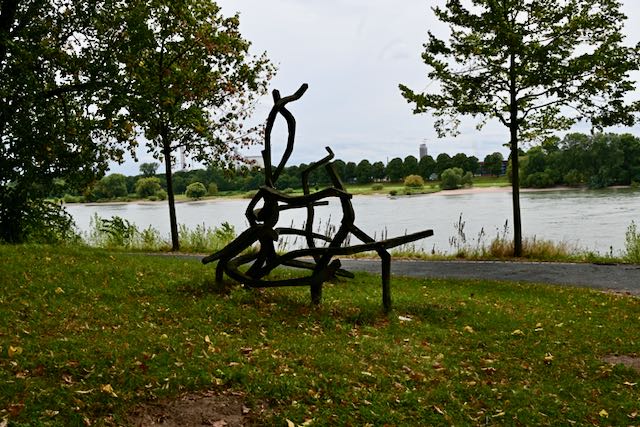 Ich glaube, man schaut sich das besser im Frühjahr an, denn einige der Kunstwerke waren offensichtlich nicht für Starkregen geeignet. Der schöne Baumbestand beeindruckt mich dieses Jahr mehr als die Kunst. Außerdem wird es langsam dunkel – also zurück auf der Rheinstrecke Richtung Deutz.