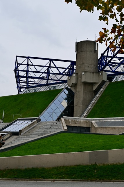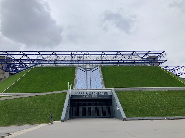 Die pyramidenförmige mit Rasen bedeckte Sportarena und Konzerthalle Palais Omnisports de Paris-Bercy (Accor-Arena) ist mir am Abend vorher schon aufgefallen.