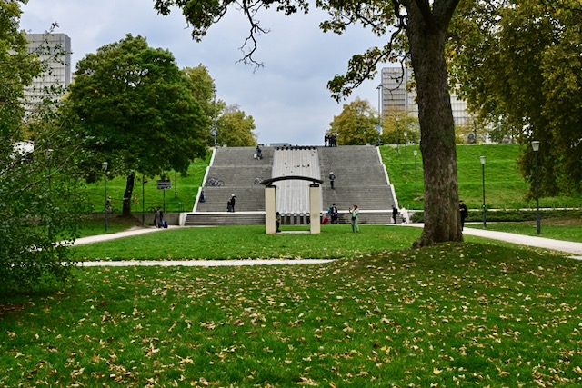 Die pyramidenförmige mit Rasen bedeckte Sportarena und Konzerthalle Palais Omnisports de Paris-Bercy (Accor-Arena) ist mir am Abend vorher schon aufgefallen.