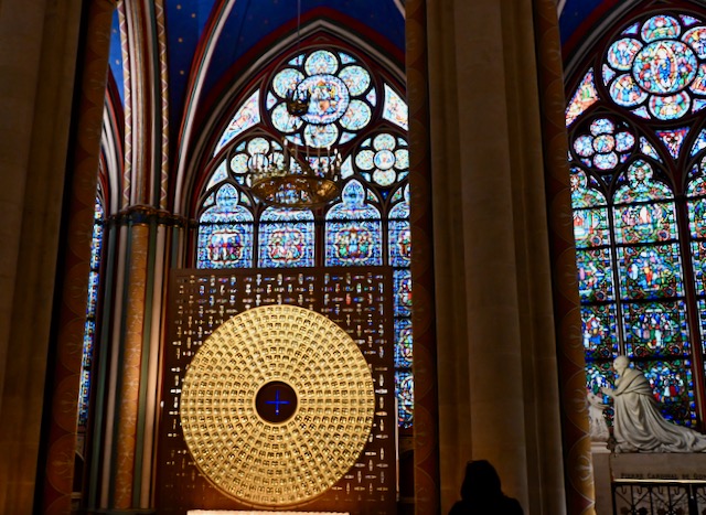 Notre-Dame ist ebenso wie der Kölner Dom eine gotische Kathedrale. Gut zu erkennen an dem extrem hohen Innenraum und den Spitzbögen und den hohen Fenstern, die viel Licht herein lassen. Die geschnitzten Chorschranken sind allerdings aus dem Barock.