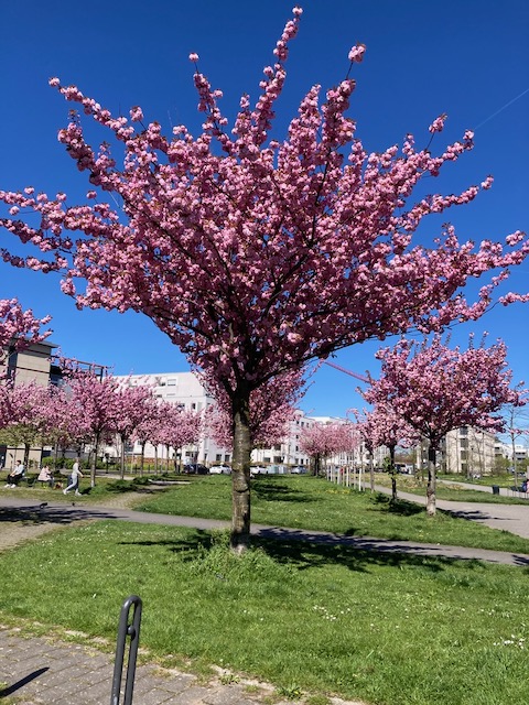 In Kalk blühen die Kirschbäume. Dies ist übrigens das Gelände der ehemaligen chemischen Fabrik Kalk, wo neben dem Einkaufszentrum auch Wohnungen und ein Park entstanden sind.